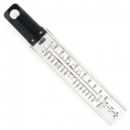 Vervaardigt uit RVS. Gehard laboratorium glas. Temperatuur bereik 40 tot 200°C. Waterbestendig. Zowel hangend als staand te gebruiken. 5 jaar garantie op materiaal en constructiefouten. Gebruiksadvies: bonbons, suiker, gelei en frituur.
