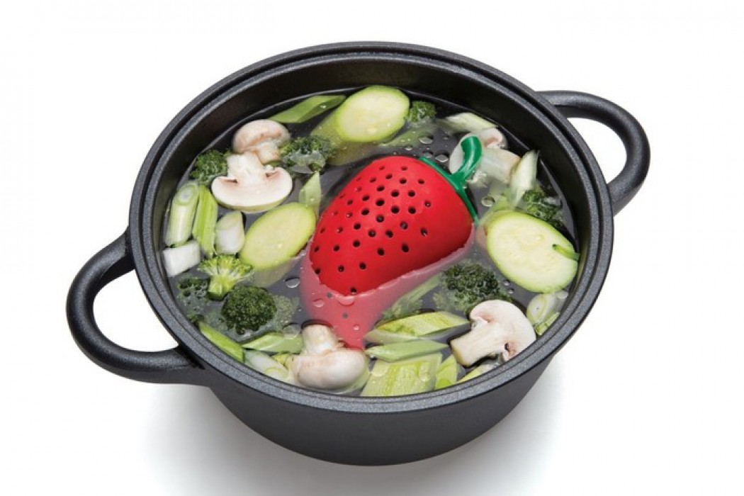 Chili van Ototo houdt al je kruiden bij elkaar tijdens het koken van je soep je boeuf bourguignon of andere gestoofde gerechten, zodat je niet naderhand de kruiden er uit hoeft te vissen. Je stopt alles om je gerecht op smaak te brengen in de Chili en de Chili in je pan. Na gebruik haal je de Chili uit de pan en spoel je de kruiden er gemakkelijk uit. Bijkomend voordeel is dat je geen peterselie uit je tanden hoeft te pulken! Het Chili kruidenbuiltje is 13.5 x 7 x 8 cm