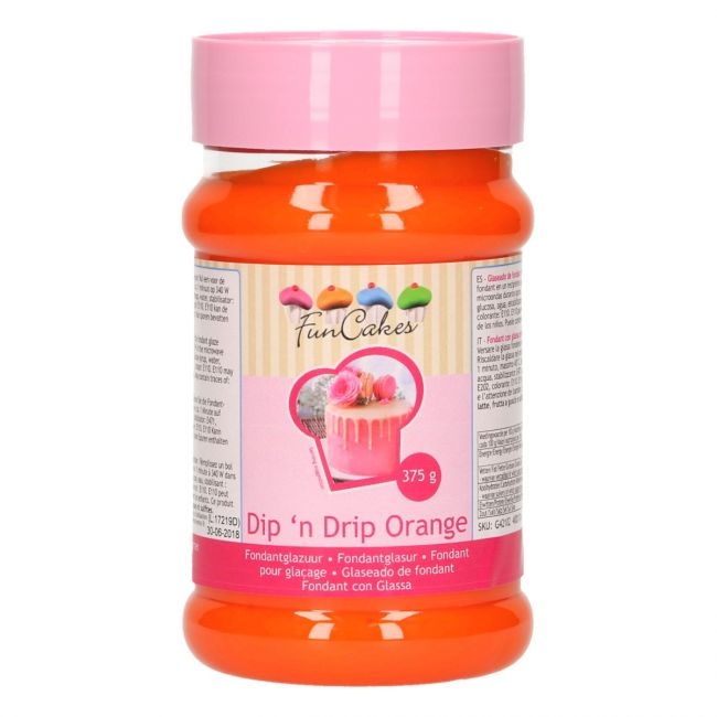 Met de FunCakes Dip ’n Drip oranje kun je je cupcakes, donuts of taarten voorzien van een laagje glazuur dat uithardt. Deze Dip ’n Drip is ook wel bekend als fondant glazuur or smelt fondant. Je kunt deze glazuur eenvoudig in de magnetron smelten, doop daarna de cupcake erin of giet het over de taart. De glaze droogt goed op, geeft een prachtige glans en is tevens ook eenvoudig te gebruiken om wat accenten aan te brengen d.m.v. een spuitzak.