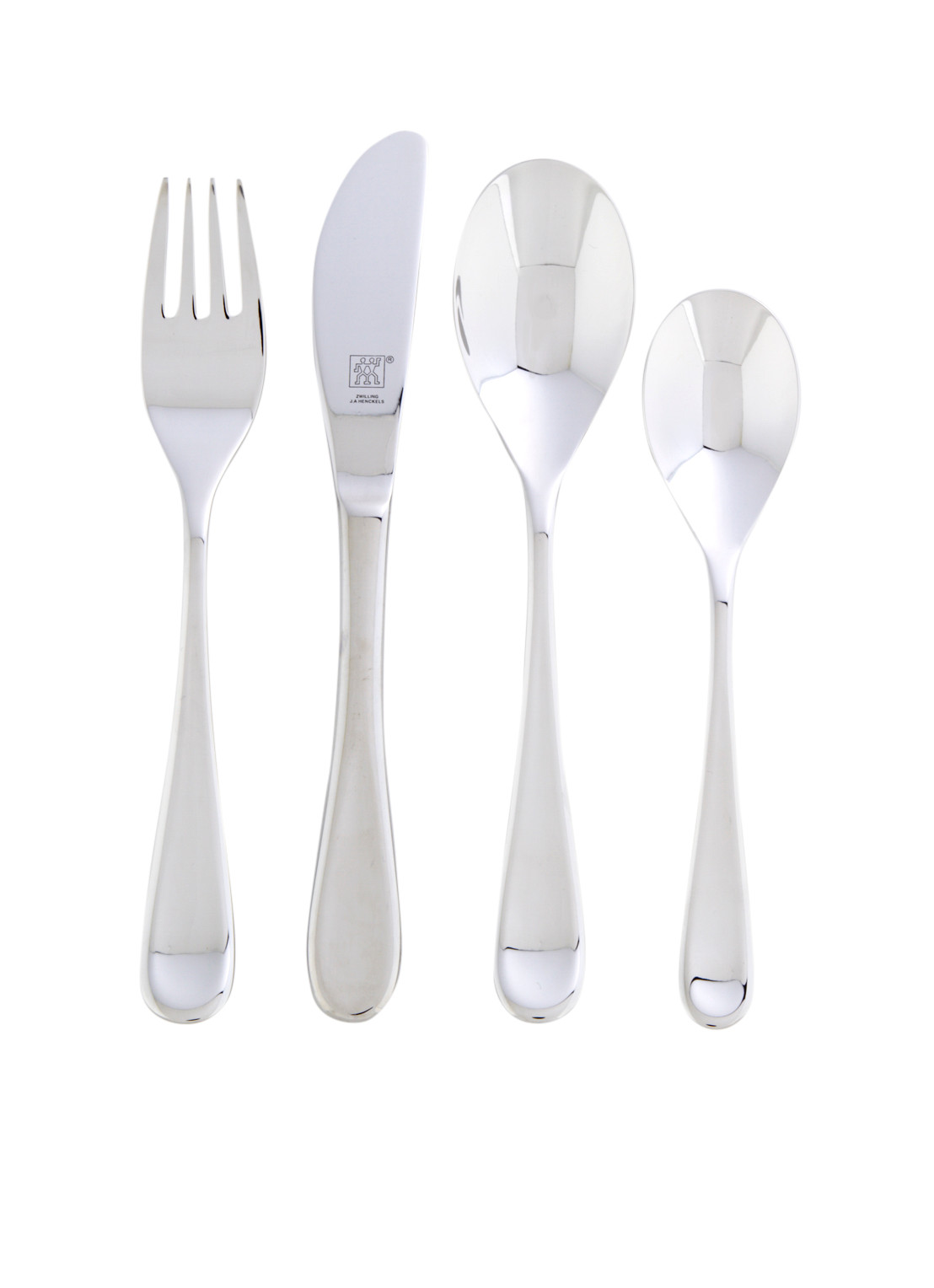 Kinderbestek Filou van Zwilling J.A. Henckels. Deze neutrale 4-delige bestekset uit de Twin Kids collectie bestaat uit een vork, mes en twee lepels.