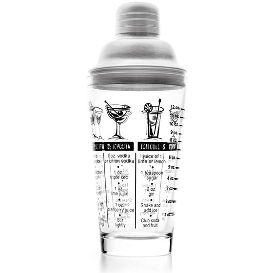 Cocktail shaker van glas met daarop recepten voor overheerlijke cocktails.