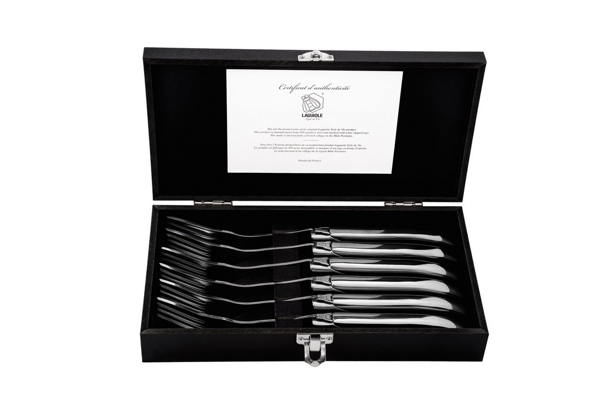 Laguiole Style de Vie Luxury Line vorken 6 stuks rvs – Deze set van Style de Vie bestaat uit 6 vorken van hoogwaardige kwaliteit, met een handgreep uitgevoerd in RVS. De vorken hebben een zeer luxe uitstraling en worden geleverd in een mooie houten kist. Deze vorken zijn vaatwasmachinebestendig tot 55 graden.