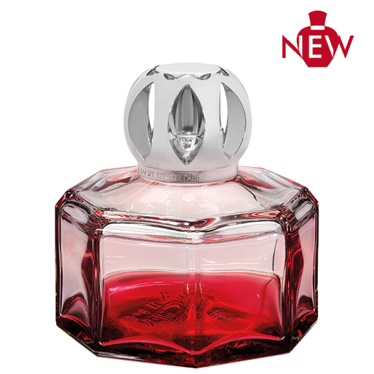 De geometrische vorm wordt gereflecteerd door de combinatie rode lak die de onderkant van de Lampe Berger op subtiele wijze versierd en de vorming van het glas. Dit prachtige model wordt verfraaid met een elegante bolvormige in glanzend zilver afgewerkte sierdop.