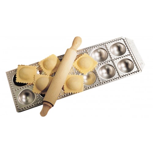 De mal is inclusief houten rolstok en is goed voor 12 ravioli’s van zo’n 5 cm.