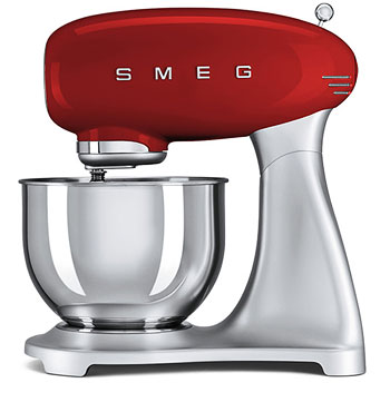 Het Italiaanse SMEG staat bekend om haar retro jaren ’50 design en deze stijl is ook de basis geweest voor de SMF01 keukenmachine. Het bovengedeelte van de keukenmachine is afgewerkt met kunststof in de verschillende SMEG kleuren en in dit geval rood. Het onderste deel van de machine is afgewerkt in geborsteld roestvrij staal.